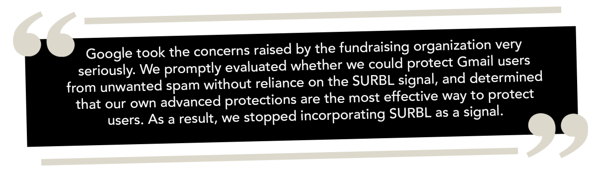 The above quote is from a letter Anne Wall, head of federal government affairs and public policy at Google, sent to FTC Chairman Andrew Ferguson in response to his complaint about Google using Netherlands-based SURBL to flag certain emails as spam. It seems like Google’s action here has put a nice bow on the whole WinRed/Google/SURBL drama that consumed much of our fundraising ecosystem a few weeks ago. At least for now, anyway…