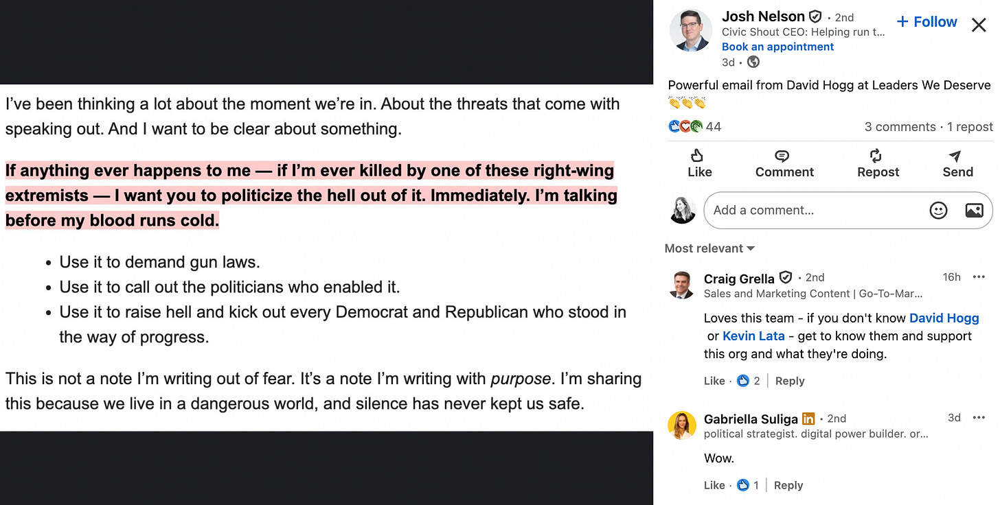 So…Civic Shout’s Josh Nelson highlighted this fundraising email from David Hogg and Leaders We Deserve on his LinkedIn as being SO powerful. And…I could not have a more opposite reaction. This email is disgusting. Seriously. When lefty psycho violence is on the uptick and a major conservative cultural figure was just assassinated…you’re gonna send out an email about “right-wing extremism” that imagines your own assassination? WTF. I alway knew Hogg had problems, but this is some next-level shit.