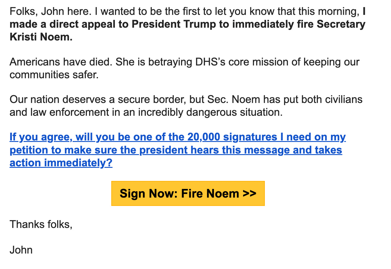 The Stop Newsom PAC - from sender “GOP Headquarters” - sent out a “Stand with ICE” petition. Bold move. (Couple side notes because I can’t help myself: The first line of the email had so many typos though, I almost didn’t make it through. The email promises “we want your voice, not your money,” and then links to a donate-to-submit form. Blah. It also links to a petition page on PSQ Impact, which is…interesting). On the one hand, if you’re trying to list build, I could see doubling down on ICE if it activates a certain section of the base. On the other hand, I feel like pivoting away from ICE and to “the Dems created this crisis in the first place,” is a no-brainer. But that’s just me. I also saw Elise Stefanik send out a “say a prayer for Tom Homan” email (definitely ICE adjacent), while Alabama Sen. Katie Britt sent out a straight-up ICE survey. Interestingly, Rep. Zach Nunn sent out a Kristi Noem approval poll. Yes, really. But at the end of the day…that was pretty much it. (Oh yeah I guess there was this too) But like I said - it looks like most of us took an ICE break this week. How long will it last? Only time will tell, but here’s my silver lining: Maybe we were getting a little too reliant on ICE in our messaging, and it’s a good thing we’re being forced to TRY NEW THINGS. Turn over some new leaves, and all that.