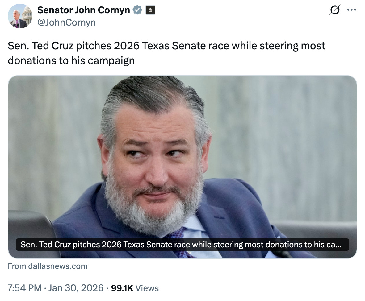 The gist? The Dallas Morning News did a write-up (how kind of them) of how Cruz is fundraising off keeping Texas red in 2026, even though he isn’t on the ballot. His pitch promises to help Texas GOP candidates, but 99% of the split goes to his own war chest. Here’s the deal, ya’ll. In a perfect world, would we label this as a stupid, deceptive tactic? Sure. But we’re not operating in a perfect world, and let’s not pretend we don’t ALL do this - or that Cornyn wouldn’t be doing the same thing if the roles were reversed. In our struggling, Republican small-dollar ecosystem, we’re all competing for scraps and of course Cruz is going to try and take advantage of a high-stakes race IN HIS STATE. To me, the more interesting question is why Team Cornyn is posting about this on X at all. It’s a little whiny and like…why throw shade when you need all the help you can get? Maybe there’s more to this story (and Texas political dynamics) that I don’t know, but for right now? Pretty sure I’m #TeamCruz on this one.