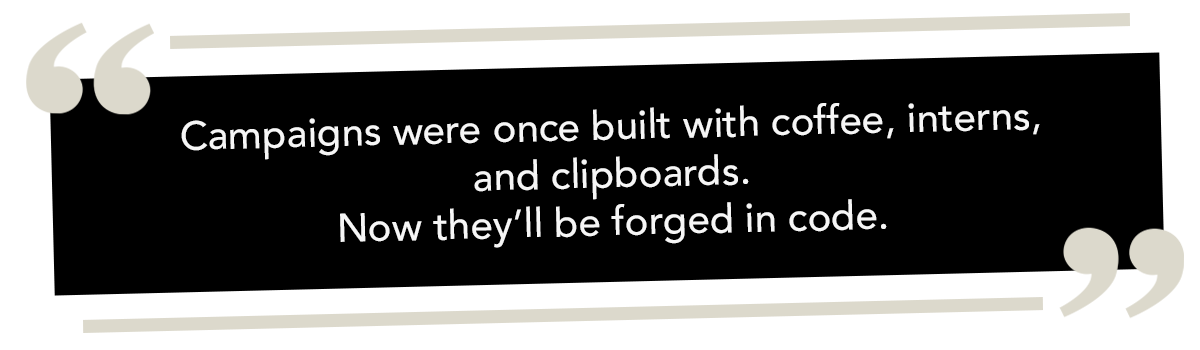 The above quote is from Push Digital’s Phil Vangelakos, and his recent thread on X about them becoming the “first AI-native political firm.” I generally agree with the sentiment in the above quote; campaigns who don’t evolve and adopt new tech are going to be left in the dust. That’s just a fact. But will they be forged in code? That’s quite a bold statement. While I hear time and again that 2026 will be the AI election, we’ll see what comes out of this rush to put everything in the hands of the AI gods. Best of luck to our friends at Push!