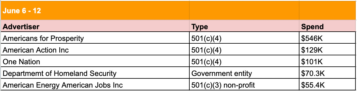 On the Republican side, Trump-endorsed Former State Representative Jack Ciattarelli leads in ad support, with $5.9M supporting his candidacy. Republican group Kitchen Table Conservatives spent $1.1M opposing Bill Spadea.