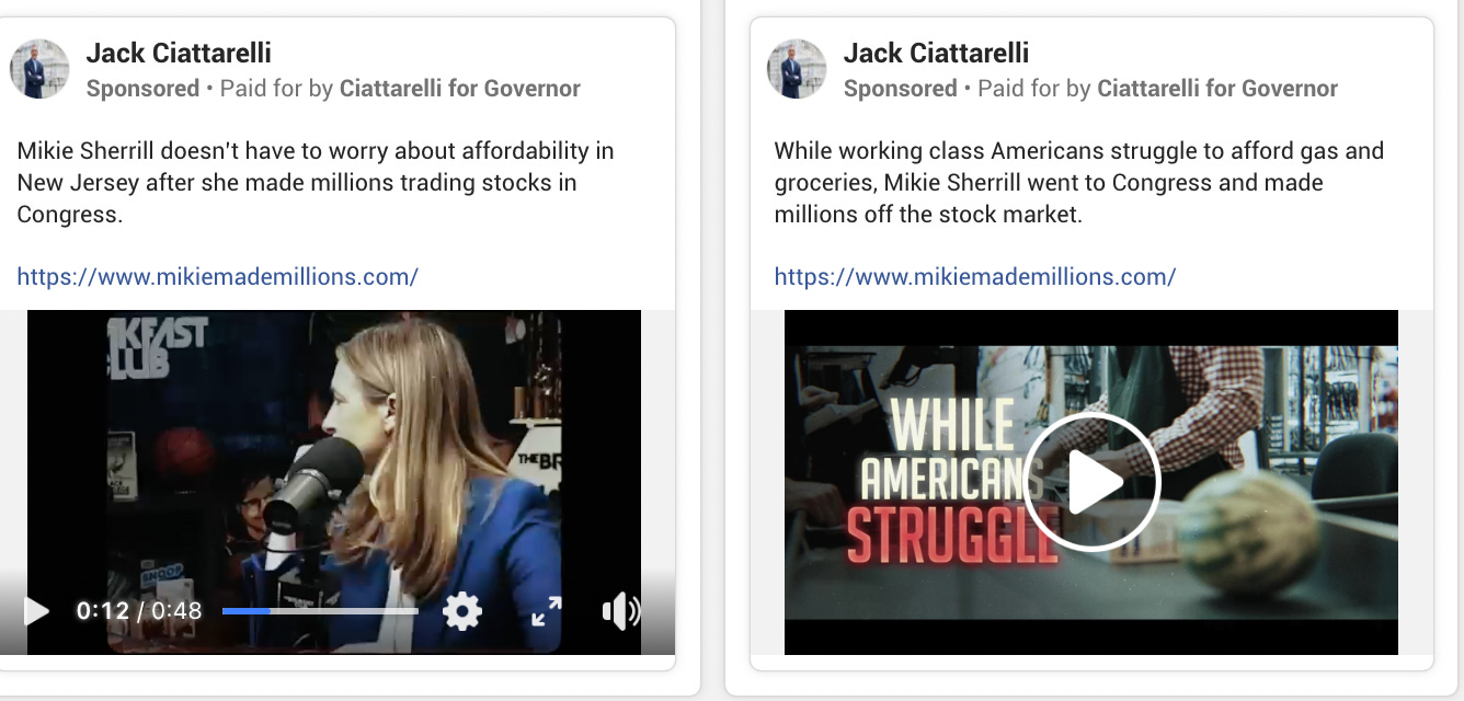 Ok - Another thing I found interesting? Before he even officially won the primary, Ciattarelli was running ads against Mikie Sherrill, the eventual Democratic nominee. And the ads are…devastating. I had no idea that Sherrill made $7 million in stock trades and tripled her net worth as a member of Congress, but I SURE AS HECK DO NOW. The accompanying microsite - mikiemademillions.com - ain’t bad, either! What’s even better is that Team Ciattarelli didn’t have to do much of the legwork at all to put these together. The ads are videos of podcast interview in which she’s asked point blank about the stock trades and fumbles all over her answer. I haven’t seen the whole interview so I have no idea what led to this line of questioning, but the fact that Sherrill didn’t have a response ready is insane. Nice week, Team Ciattarelli!