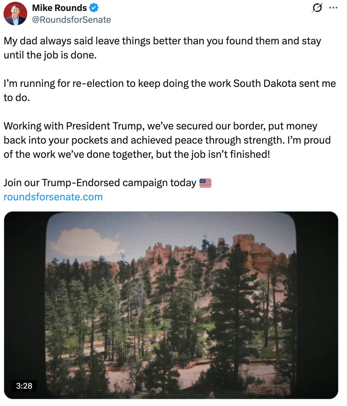Let’s continue on our journey to the midwest, where South Dakota Sen. Mike Rounds officially launched his re-election campaign. He did it with a three-and-a-half minute video, and honestly? I love it. I know it’s long, but for some reason I don’t care. Maybe it’s because I have a soft spot for former governors from the Midwest. Whatever the case may be, this is a great video for an incumbent. He speaks to camera, he gets personal, he touts local wins and makes the case for why he’s earned another term. What’s more, he talks about his support for (and from) President Trump without making his entire candidacy ABOUT TRUMP. Nicely done, Team Rounds. P.S. His website is also pretty nice.
