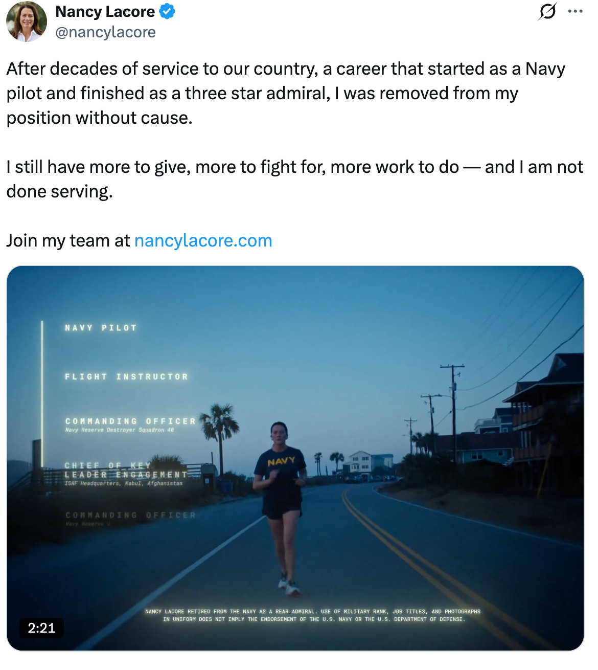 Since we’ve talked about so many videos already this week, what’s one more? This announcement video, from Nancy Lacore, is really good. She’s running to replace Nancy Mace in South Carolina’s first congressional district. She probably doesn’t have a shot, but who knows? She’s got a compelling back story and military backgrounds matter a lot in this district. But aside from that - and as much as I hope this seat stays in Republican hands - her video is excellent. And I’m usually critical of videos that show a candidate literally running while talking about “running” for office. Like…it’s been done so many times. But this one works! The visuals are interesting, the narration is good…love all of it. But she definitely has awareness of the red district she’s running in. If you were only going off this video or her website (which isn’t bad considering it’s Squarespace), you’d never really know she was a Democrat until clicking on the donate button and seeing that it takes you to ActBlue.